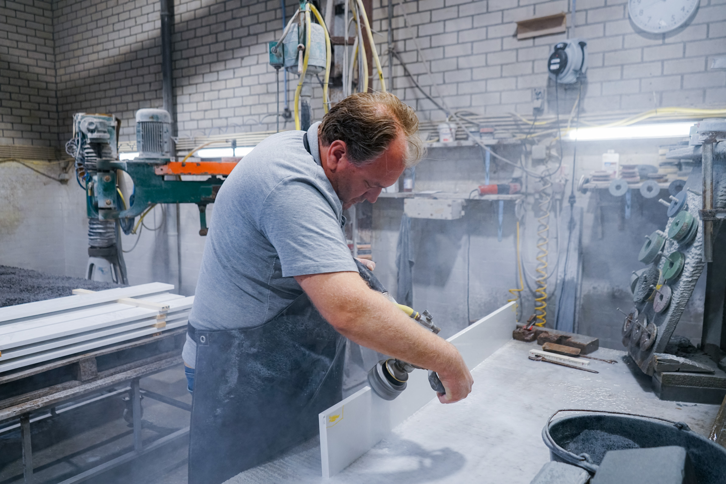 Wij produceren onze natuurstenen eerste stenen vrijwel geheel zelf in onze steenhouwerij in Nijmegen. Daarbij beschikken wij over alle benodigde kennis en apparatuur om elk detail nauwkeurig te bewerken en te realiseren volgens de wensen van onze klanten. Daarnaast houden we op deze manier volledige controle over het productieproces en de kwaliteit van het eindproduct. Hierdoor kunnen we consistent leveren wat we beloven: een duurzame, mooi afgewerkte eerste steen die perfect aansluit bij het karakter van het bouwproject.