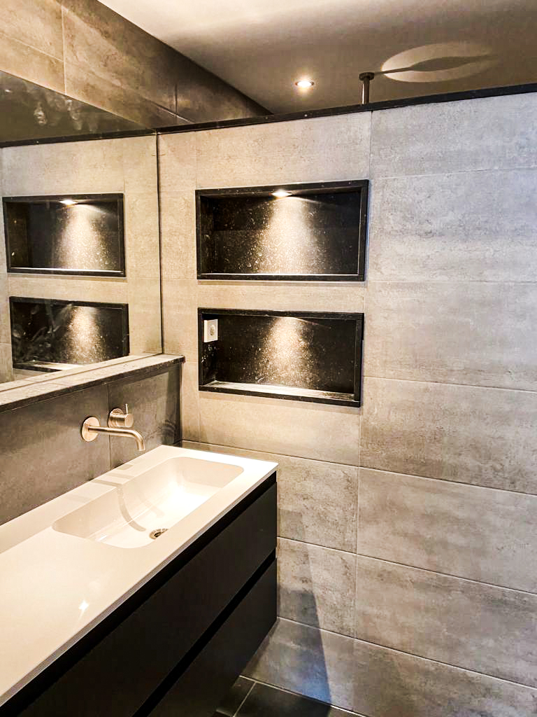 In de badkamer zijn er diverse toepassingen mogelijk om een natuursteenlook te creëren. Er kan gebruik worden gemaakt van verschillende soorten natuursteen, zoals hardsteen (bijvoorbeeld graniet, Belgisch hardsteen en basalt) en zachtsteen (zoals marmer en kalksteen). Composiet, daarentegen, is een kunstmatig mengsel van natuurlijke mineralen (zoals kwarts) en harsen. Al deze soorten natuursteen kunnen op verschillende manieren worden toegepast, zoals in tegels en platen voor vloeren en wanden (bijvoorbeeld mozaïektegels), maar ook in natuurstenen planchetten, wastafels en vensterbanken. Deze natuurlijke materialen zijn beschikbaar in verschillende formaten en kleuren, waardoor ze gemakkelijk aan te passen zijn aan diverse stijlen en interieurbehoeften. Dit maakt ze ideaal voor zowel moderne als klassieke interieurontwerpen, waarbij ze een tijdloze en luxe uitstraling bieden.