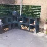Deze tuin is voorzien van een prachtig ambachtelijke buitenkeuken, uitgevoerd in Belgisch hardsteen. Het keukenblad heeft een uitsparing die perfect aansluit op de ronde barbecue.