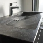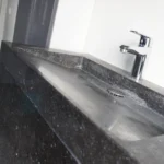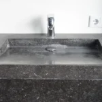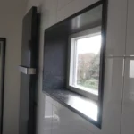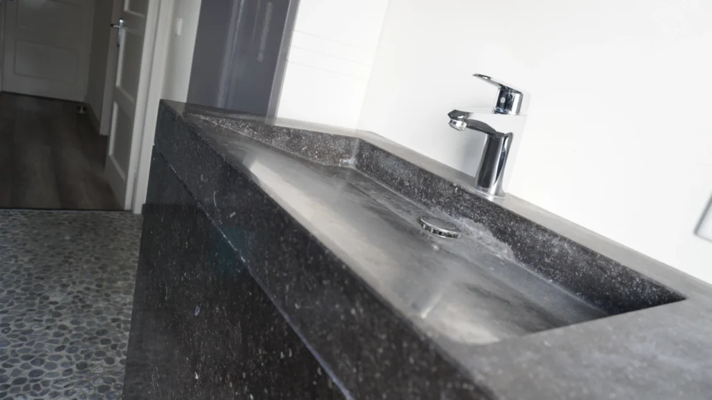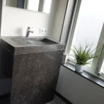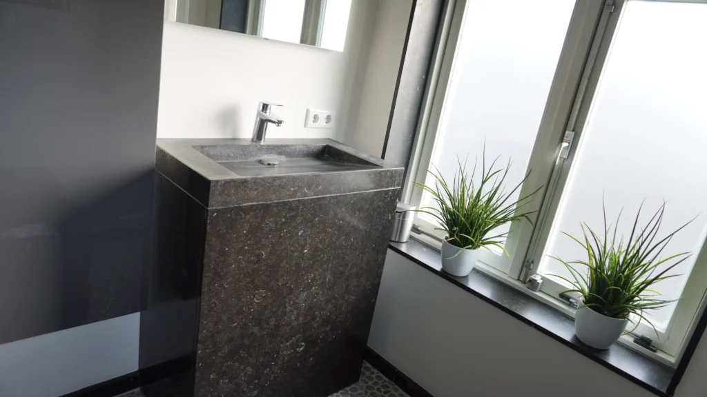 Het woonhuis in Nijmegen hebben we mogen voorzien van een volledig massieve wastafel van Belgisch hardsteen. De spoelbak is CNC gefreesd en loopt schuin af. De vensterbank is van hetzelfde donkere Belgisch hardsteen, met een gezoete afwerking. Hierdoor krijgt de badkamer een uniforme, chique uitstraling.