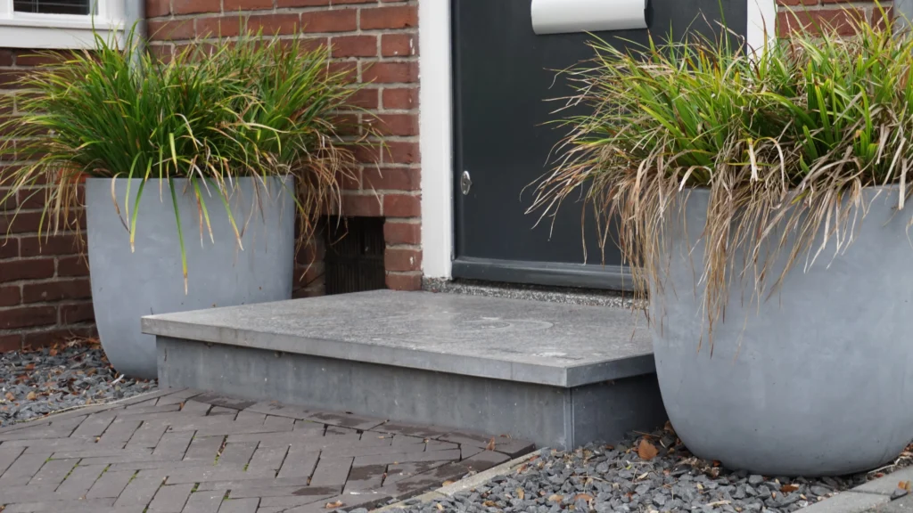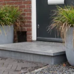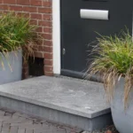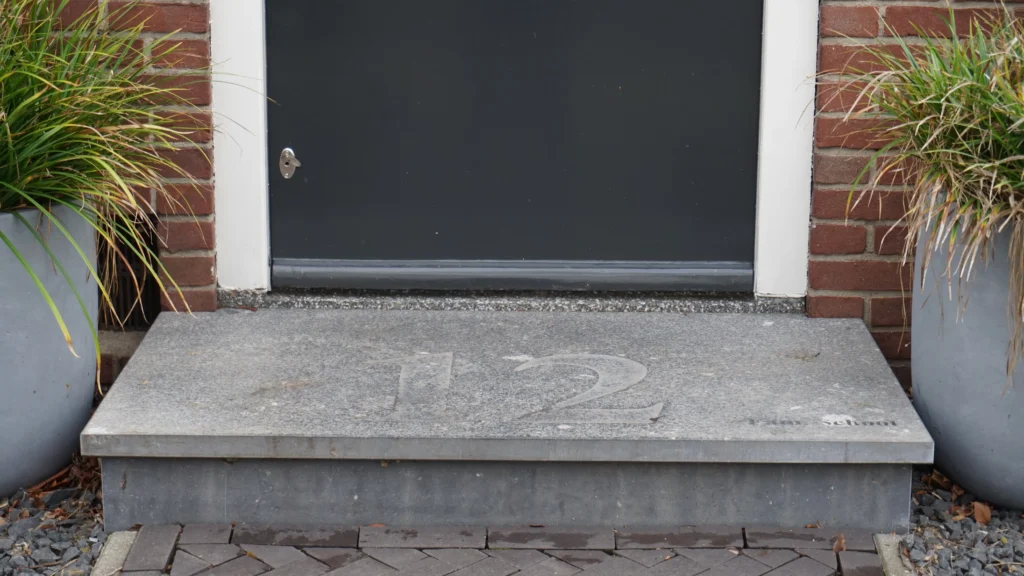 In Nijmegen hebben we de voordeur mogen voorzien van een Belgisch hardsteen bordesplaat. Door een bordesplaat te plaatsen, is het hoogteverschil van de deur en de straat op een fraaie manier weggewerkt. Deze bordesplaat is gebrand geborsteld, waardoor het oppervlak een antislip laag bevat. Daarnaast is het huisnummer in het oppervlak gezandstraald.