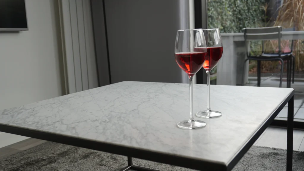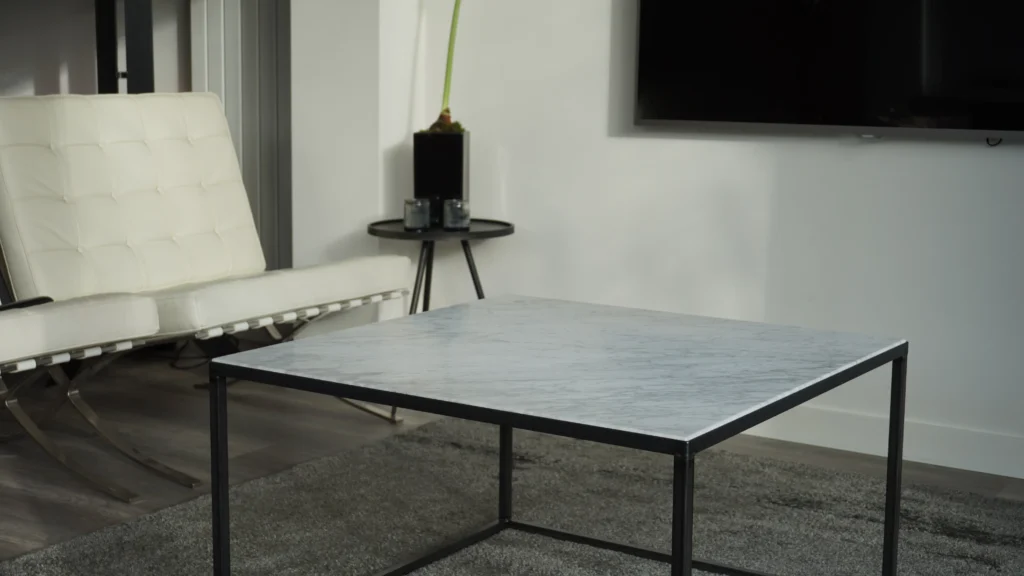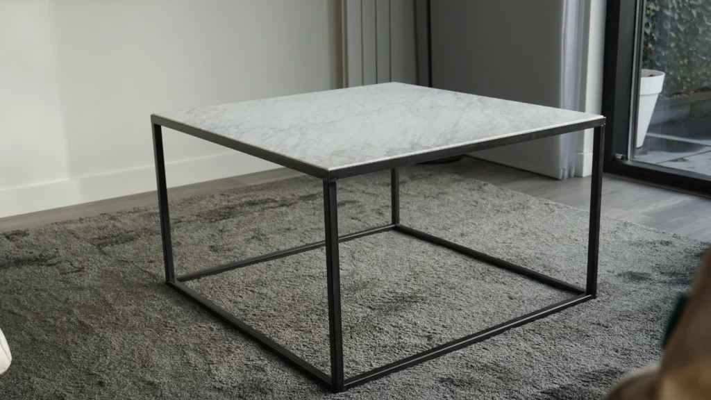 In deze woning in Nijmegen hebben we de woonkamer verfraaid met een blank stalen salontafel met een marmeren Bianco Carrara tafelblad. De combinatie van het klassiek ogende marmer met het industriële staal creëert een unieke, eigentijdse uitstraling.