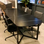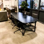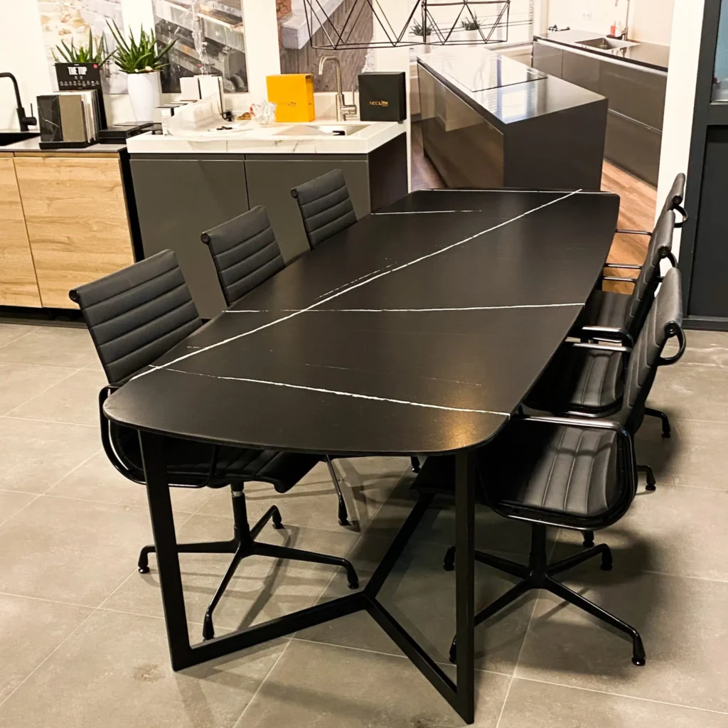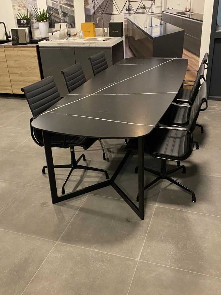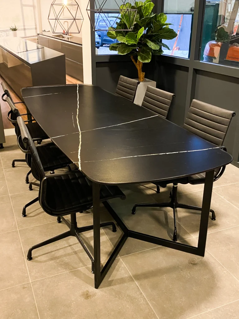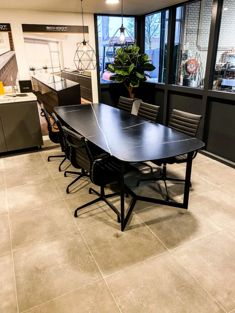Om onze eigen werkplaats op te frissen, hebben we een zwart Silestone Etenoir suède composiet tafelblad gemonteerd op het stalen onderstel. Het eindresultaat is een chique maar stoere tafel, die goed bestand is tegen krassen en stoten. Deze tafels kunnen wij compleet leveren in elke gewenste maat en vorm, inclusief onderstel!