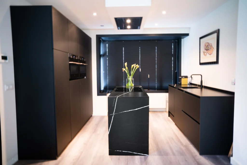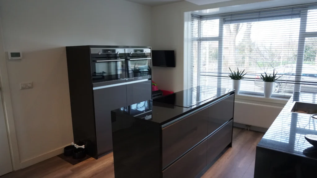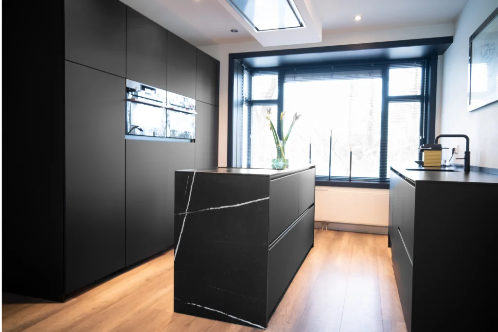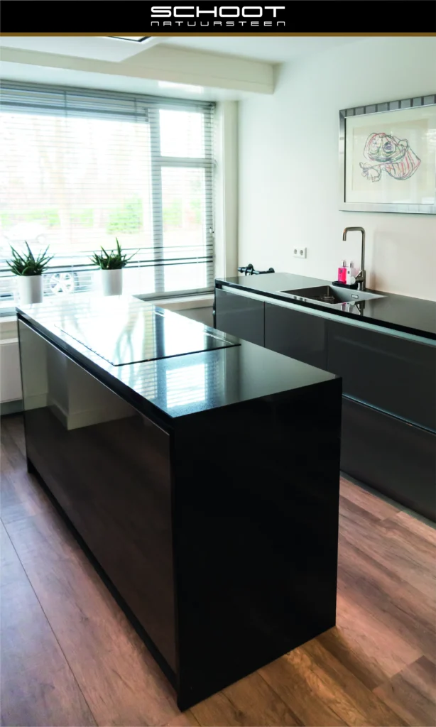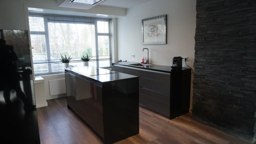 In dit huis in Nijmegen hebben wij de keuken mogen voorzien van natuursteen elementen. Zo is deze keuken voorzien van Nero Assoluto granieten aanrechtbladen. Dit zwart granieten blad loopt door over de zijkanten. De gepolijste afwerking zorgt voor een chique, glanzende uitstraling.