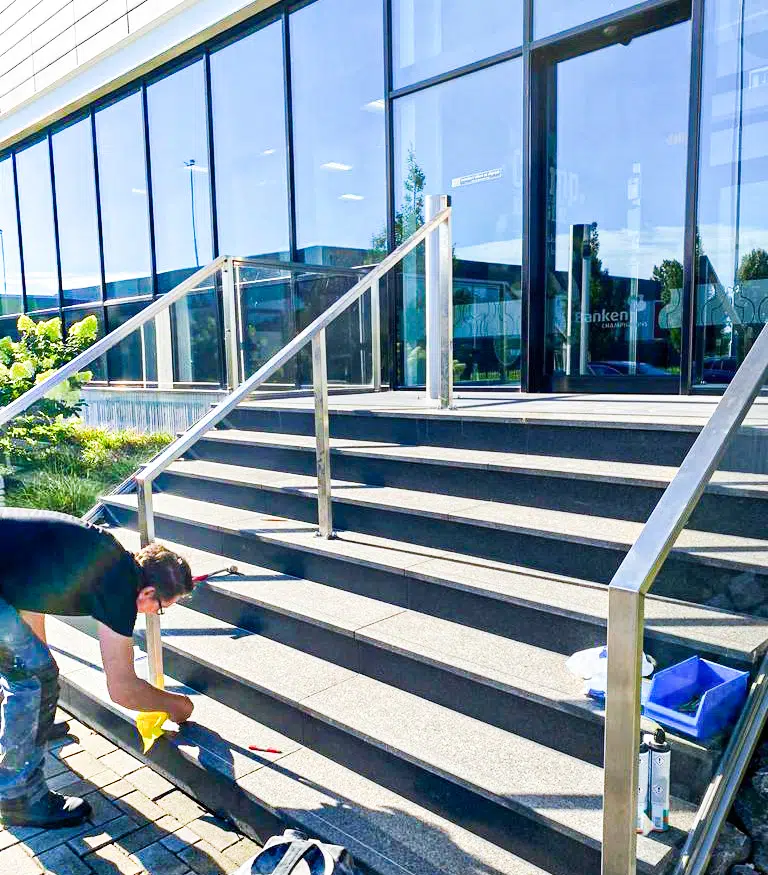 Voor het bedrijfspand van Bankenchampignons hebben we in samenwerking met onze partners een drietal Angola Black granieten exterieur trappen mogen ontwerpen. Deze trap is met antislip patronen afgewerkt en voorzien van roestvrijstalen strips en leuningen. Hierdoor zijn de trappen veilig te betreden bij zowel regen als zonneschijn!
