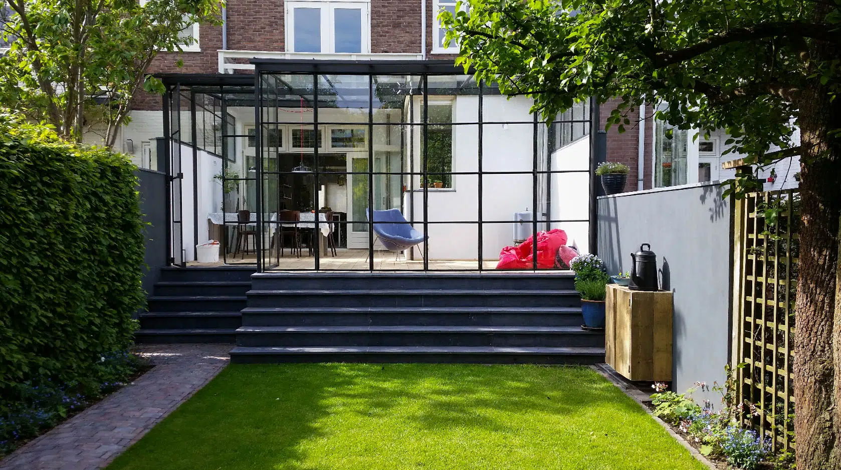 Bij deze woning in Nijmegen hebben we de tuin mogen voorzien van een Belgisch hardsteen trap. De traptreden zijn 3cm dik en bevatten stootborden, waardoor de trap volledig dicht is. De treden zijn geschuurd, voor een robuuste uitstraling en een antislip effect, zodat je niet uitglijdt bij nat weer.